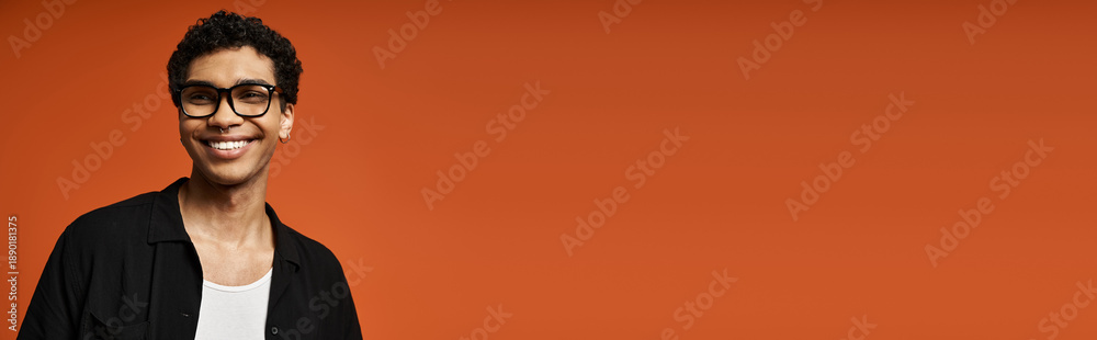 Stylish young African American man with eyeglasses smiles in a modern studio setting