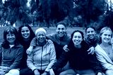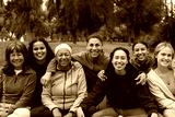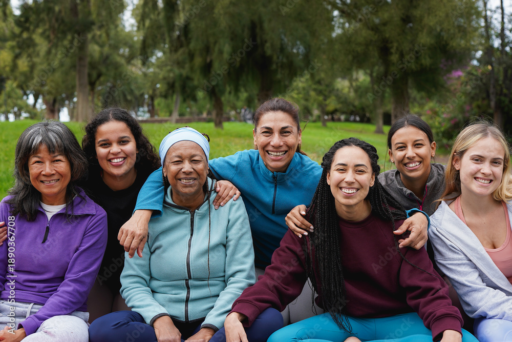 Group of happy multiracial women circle smiling on camera outdoor - Female multi generational community, support and diversity concept