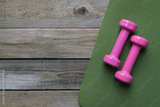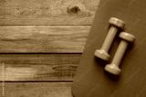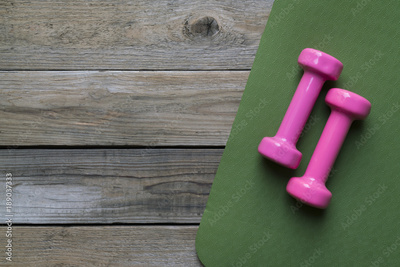dumbbell and yoga mat on table, fitness healthy and sport concept