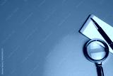 Research concept. Magnifying glass pen notepad blue background office tools close up writing instrument paper investigation study focus detail inspection business