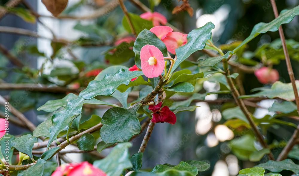 Thornless Crown of Thorns or Gerold's Spurge ornamental shrub (Euphorbia geroldii). Bright red rounded flowers atop reddish stems with dark green glossy lanceolate leaves