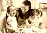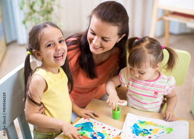 Mother and daughters are painting together. Happy family are coloring with paintbrush. Woman and children have a fun pastime.