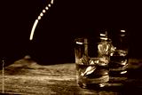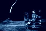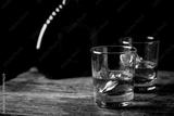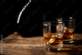 Whiskey with ice in glasses and bottle, dark background, copy space