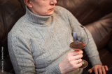 Relaxed serene rich lonely middle aged single man drinking red wine relaxing on sofa at home, enjoying resting sitting on couch holding glass tasting and reflecting.
