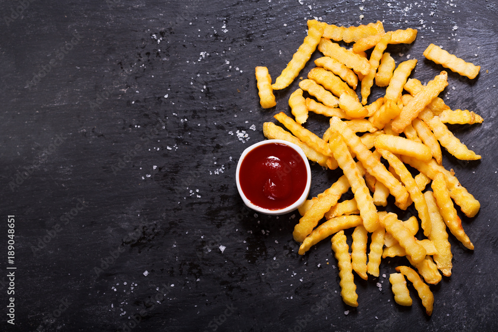 French fries with ketchup on dark table