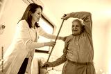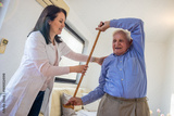 Caregiver assisting elderly man with rehabilitation exercises at home