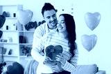 Young lovely couple with gift hugging at home. Valentine's Day celebration