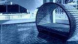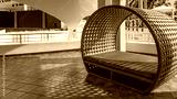 A place to relax. A bench with a soft mattress and a semicircular lattice canopy is installed on the tiled terrace. Shadows on the floor. resort. Hotel. Cuba. Varadero