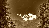 Beautiful mountain landscape. Peaks against a background of blue sky and clouds. Framing with branches of green trees. Peru. The Andes Mountains. Machu Picchu