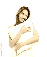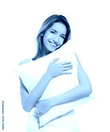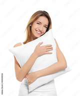 Young woman with soft pillow on white background