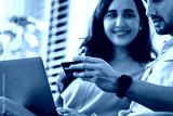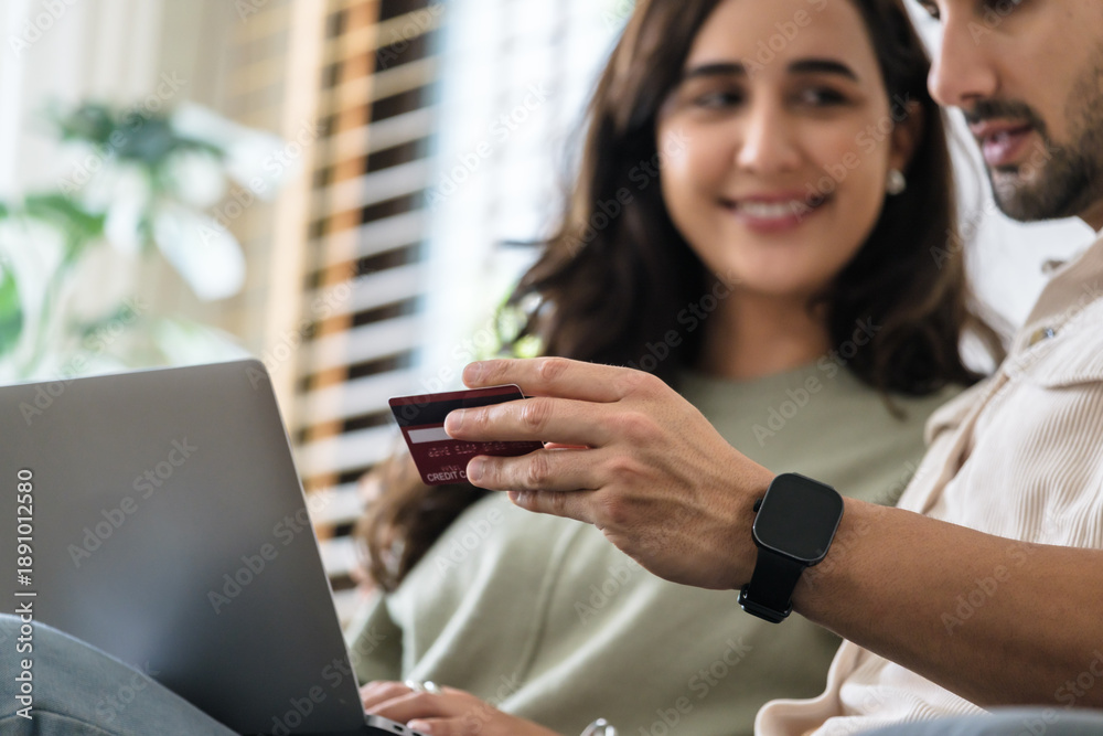Happy couple using credit card and laptop at home for seamless online shopping experience with smartphone