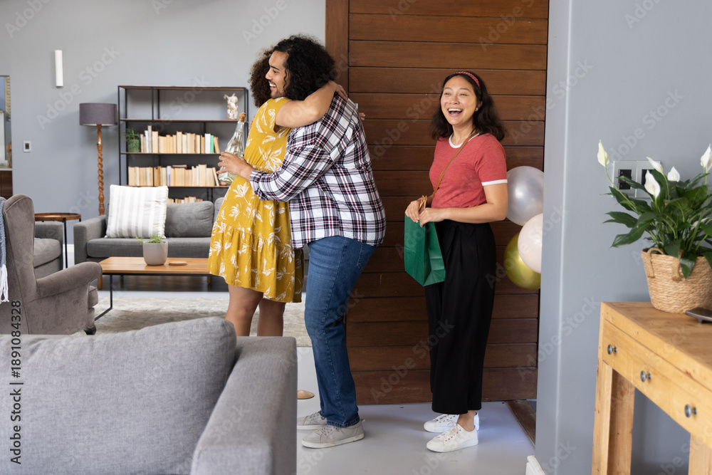Diverse friends hugging and exchanging green gift bag in modern living room, pastel balloons
