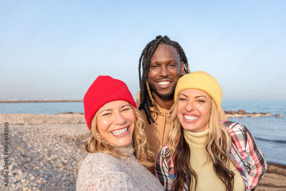 Happy multiracial diverse friends smiling and taking selfie on the beach