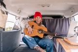 Happy Woman in red beanie playing guitar and streaming live music inside camper van