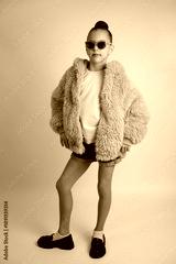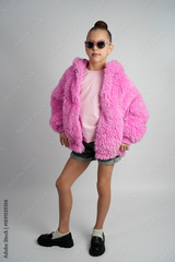 Stylish Young Girl in Bright Pink Faux Fur Jacket and Sunglasses