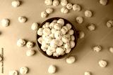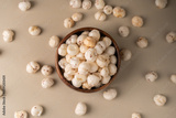 Phool Makhana, Fox Nut, Lotus Pops Seeds, Gorgon nut, Euryale Ferox on a wooden bowl with beige background.