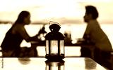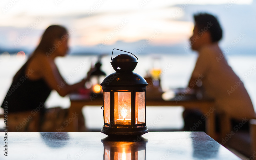 Romantic couple dating dinner blur background under candle light lantern and sunset twilight sky with clouds during beautiful golden hour evening at restaurant bar cafe for valentine's day