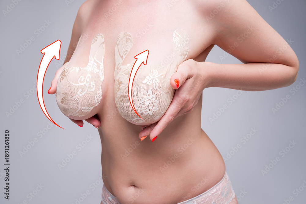 Breast lift concept, woman wearing adhesive lace tape with red arrows showing upward effect, mastopexy and support