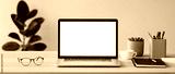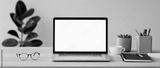 Laptop computer with empty blank mockup screen over modern living room design panoramic banner. Advertisement, e-learning, shopping online, web site design, technology concept.