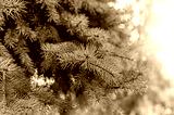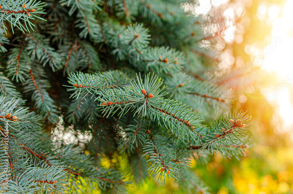 Blue spruce branches with sharp needles illuminated by warm golden sunlight in a natural forest setting.