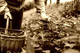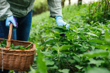 Woman picking nettle herbs into basket at springtime in nature. Herbal harvest for alternative medicine