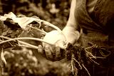Kohlrabi in female hand. Farmer harvesting ripe organic kohlrabi in vegetable garden