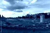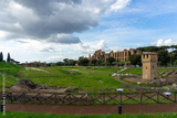 Ancient Roman Ruins of Circus Maximus Chariot Racing Stadium and Palatine Hill Imperial Palaces in Rome Italy featuring Medieval Torre della Moletta under Cloudy Sky