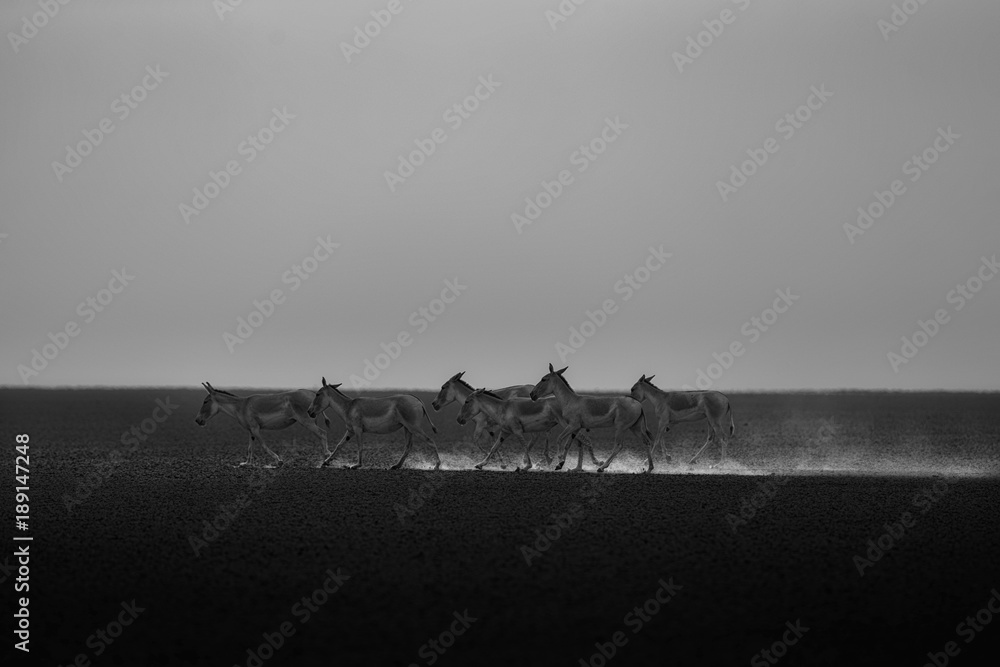 Artistic, black and white photo of indian wild ass, Equus hemionus khur, for fineart prints, close up to photographer with a touch of beautiful nature environment.