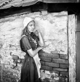 pensive young woman in a rustic dress standing near old brick wall in old house feel lonely. Cinderella style