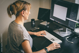 Female works with tables on her personal computer with big display. Woman works at home on comfortable place