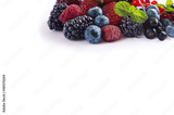 Mix berries isolated on a white. Ripe blueberries, blackberries, red currants, black currant, raspberries and strawberries. Various fresh summer berries on white background.