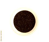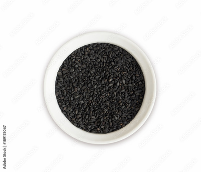 Black sesame on white background. Top view. Black sesame in a bowl isolated on white background. Sesame with copy space for text.