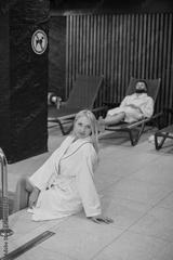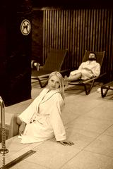 Couple relaxing at modern hotel spa complex