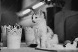 Sweet fluffy kitten observes pencils and decorative jar in living space