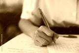 Closeup to hand of student holding pen and taking exam in classroom with stress for education test.