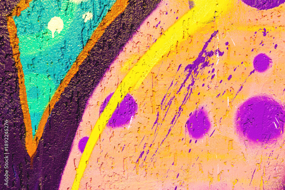 Abstract purple, yellow, turquoise graffiti wall. Modern 2000s Posters, Y2K style flyers, digital art, urban visuals, modern 90s, 2000s, y2k creative banner, summer visuals.