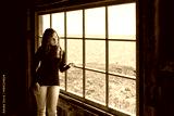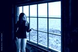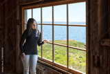 Side of one, lonely, alone young woman standing by large glass window looking at peaceful ocean view, cliff, in rustic wooden house