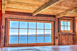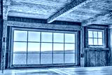 Looking through old window of house with cliff and ocean view in Bonaventure Island, Quebec, Canada, blue water