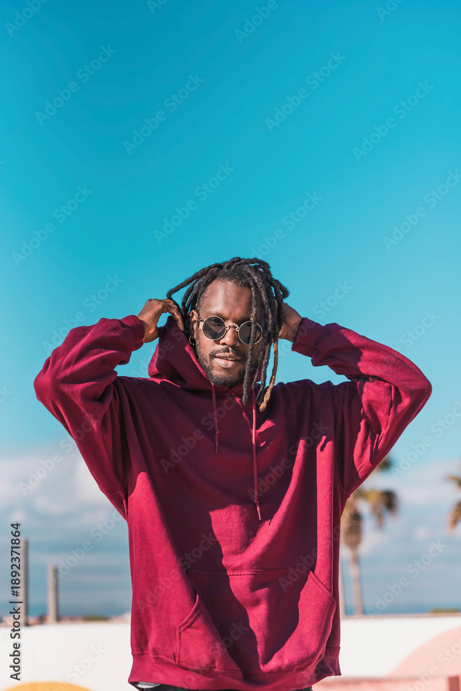 Vertical image of African american man in sunglasses and dreadlocks wearing red hoodie standing outdoors
