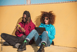Multiethnic friends browsing tablet and mobile phone on street sitting against yellow wall