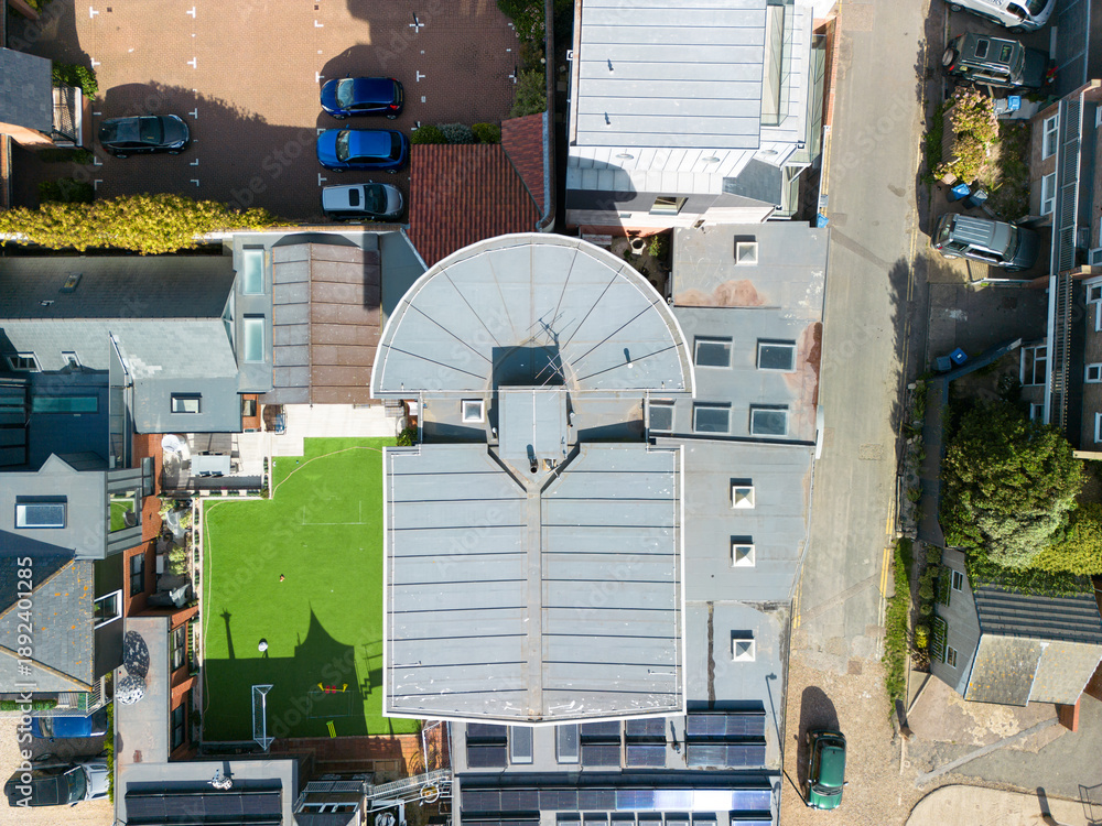 Drone top down view of an architectural designed multi floor apartment located at a beach front setting in Aldeburgh, Suffolk, UK. Note the large lawn area on the left, used as a soccer pitch.