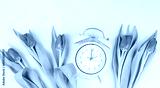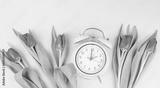 Switch to daylight saving time in spring, summertime changeover, alarm clock with red tulip flowers