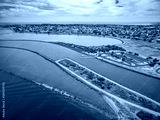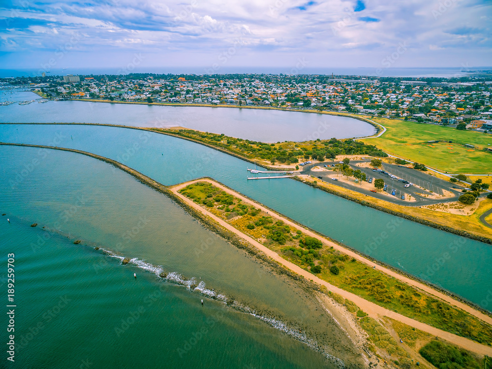 Aerial view of Yarra river mouth and Williamstown - coastal suburb in Melbourne, Australia