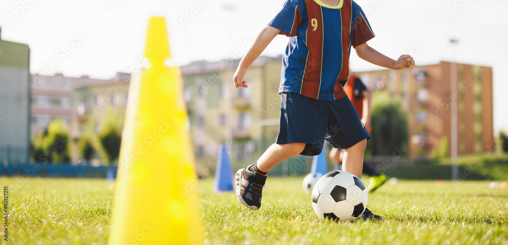 Youth Soccer Training Drill With Cone. Child Practicing Dribbling and Ball Control Outdoors