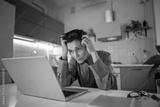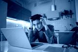 Overworked worried senior woman freelancer working on laptop late at home, sitting staring at computer screen with demoralized depressed expression, touching head with hands, burnout and fatigue..
