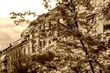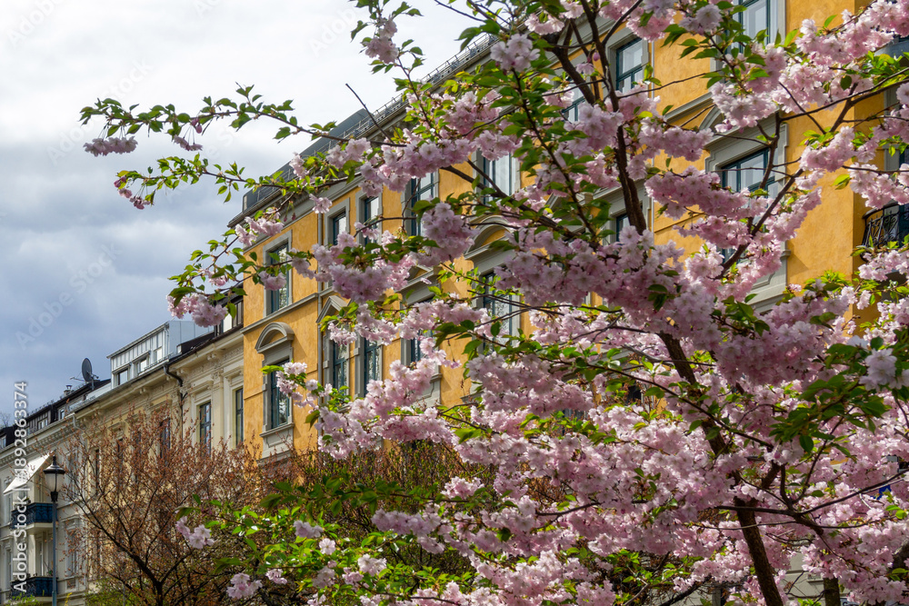 Spring in Oslo Norway with Pink Cherry Blossoms Framing Historic Yellow Neoclassical Architecture Urban Scene in Frogner District