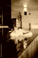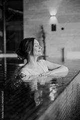 Woman enjoys relaxing moment in a pool at a wellness center during the day