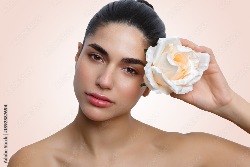 Portrait of a woman holding a flower against a neutral background with beauty makeup