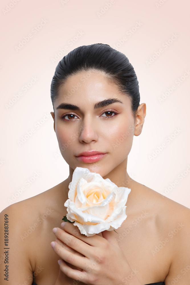 Beauty portrait with flowers and neutral background showcasing skin and makeup details