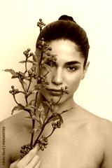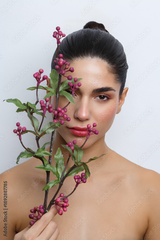 Beauty portrait with flowers and neutral background showcasing natural makeup techniques